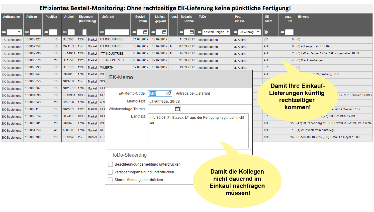Lässt sich die Bestellung nicht beschleunigen, vermerkt das der Bearbeiter in einem EK-Memo und unterdrückt damit die weitere Beschleunigungsmeldung. Das EK-Memo poppt dann im Gantt-Chart des betroffenen VK-Auftrages wieder auf.